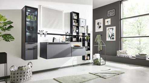 - Die Kombination aus Schränken, Waschtisch, Spiegel und Sign Emotion System sorgt für ein rundum durchdachtes Badezimmerkonzept.