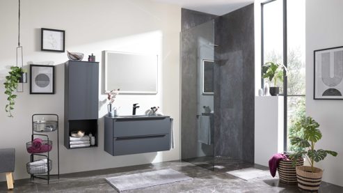 Der ca. 45 x 130 x 35 cm (BxHxT) große Midischrank mit supermatter graphitschwarzer Front, schwarzem Korpus und grifflosem Design ergänzt die Kombination perfekt. Mit Schließdämpfung, zwei höhenverstellbaren Einlegeböden, einem offenen Fach sowie einem beschichteten Abdeckboden bietet er flexible Organisation und Platz für Handtücher, Pflegeprodukte und Accessoires.